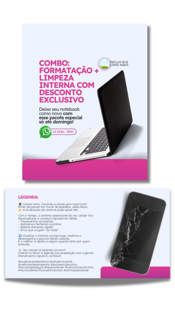 Você não precisa se preocupar com nada além de baixar o material e postar no seu Instagram, já que todos os posts já estão com conteúdo direcionado, LEGENDA PRONTA e até hashtags para atrair público interessado nos seus serviços!